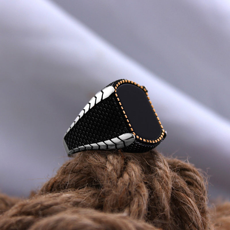 Bague hommes en argent 925 original avec la pierre onyx naturelle noire.