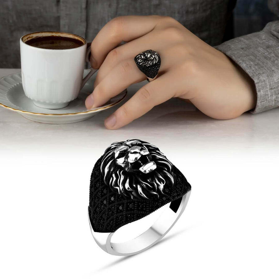 Bague hommes en argent 925 avec tête lion en pierre d'onyx aqeq.